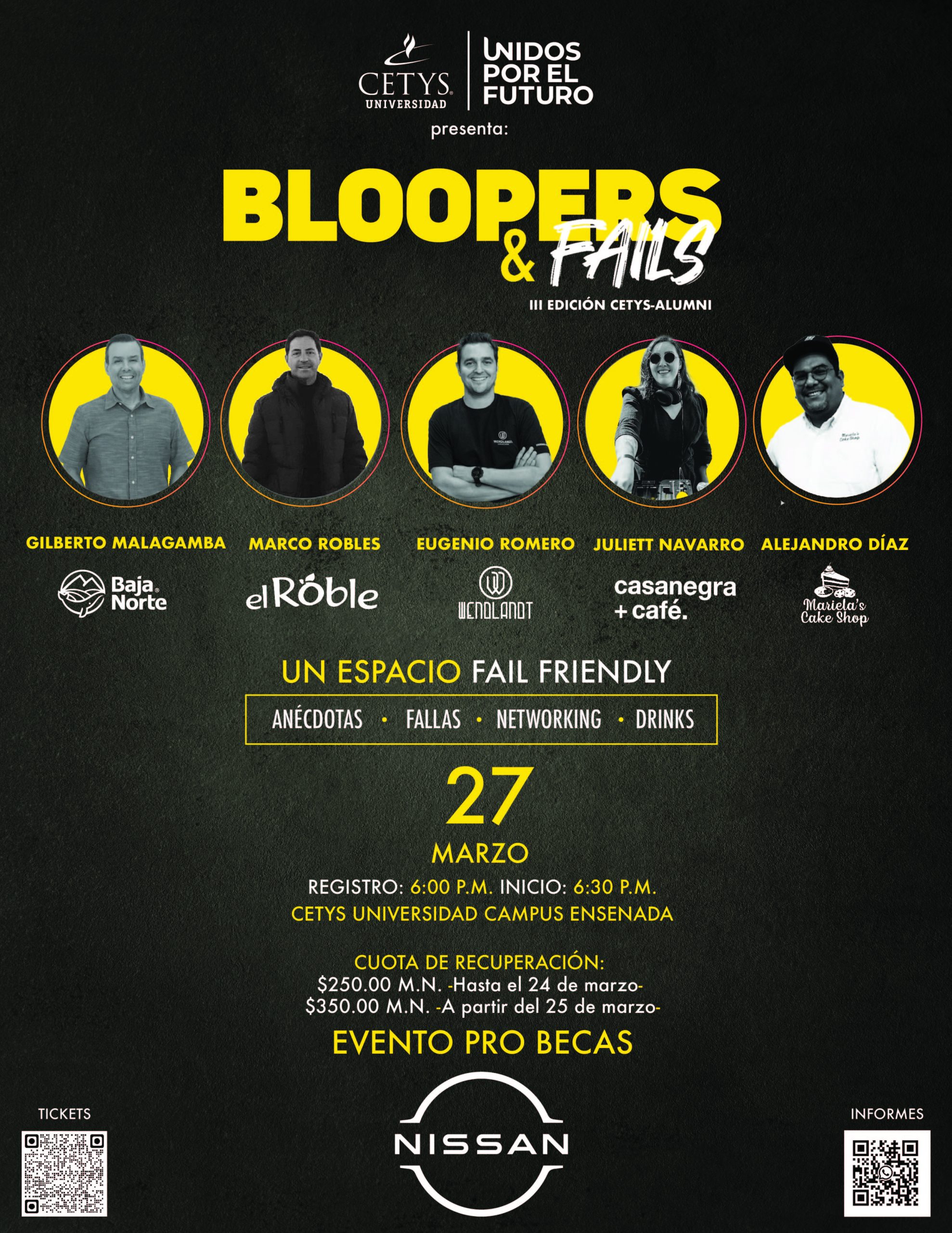 La III edición de Bloopers & Fails es un evento en el que seis empresarios reconocidos de la localidad nos cuentan sus anécdotas de fallas en sus empresas de una manera divertida y dinámica. Acompáñanos a pasar una agradable tarde de networking, además te prometemos una excelente vista al mar. Evento abierto para todo público.