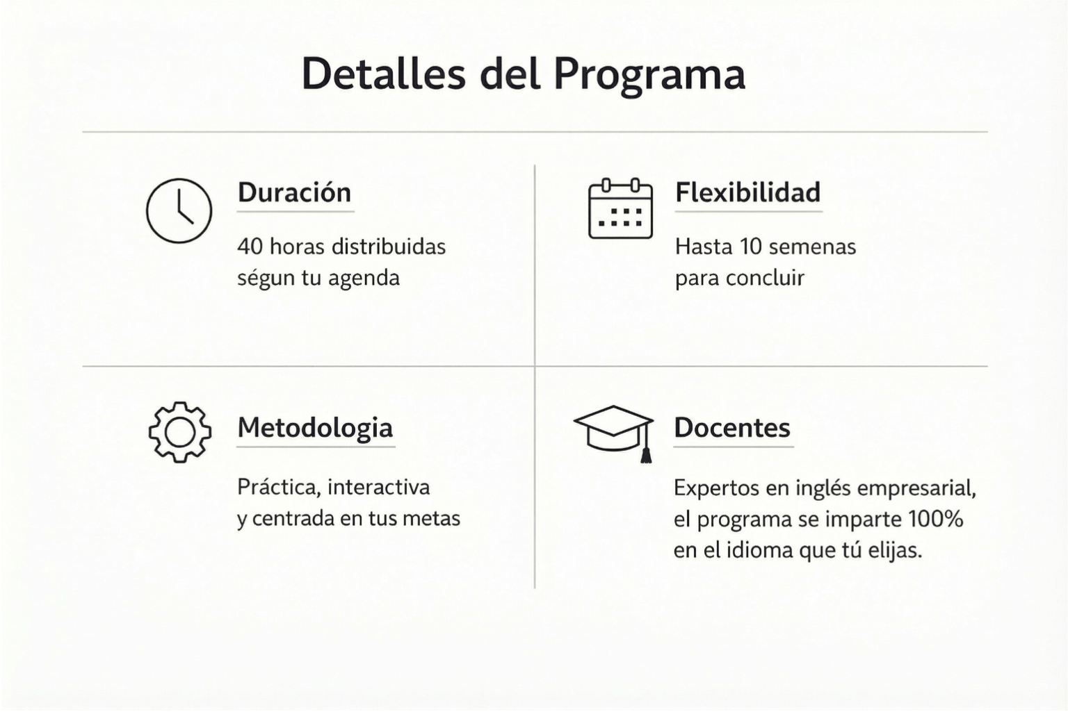 Desarrollar las habilidades comunicativas de los colaboradores para mejorar su desempeño en situaciones laborales reales: atención a clientes, redacción profesional, participación en reuniones, presentaciones y más. El contenido se adapta a las necesidades de la empresa, con un enfoque comunicativo y práctico. Todas las sesiones promueven el desarrollo de las 4 habilidades del idioma (hablar, escuchar, leer y escribir), con un enfoque centrado en el alumno .