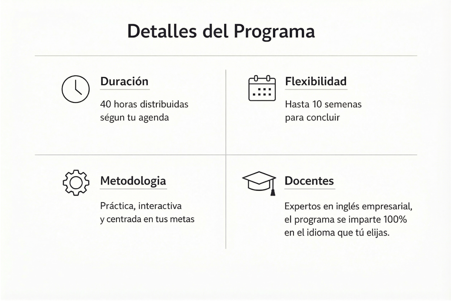 Desarrollar las habilidades comunicativas de los colaboradores para mejorar su desempeño en situaciones laborales reales: atención a clientes, redacción profesional, participación en reuniones, presentaciones y más. El contenido se adapta a las necesidades de la empresa, con un enfoque comunicativo y práctico. Todas las sesiones promueven el desarrollo de las 4 habilidades del idioma (hablar, escuchar, leer y escribir), con un enfoque centrado en el alumno .