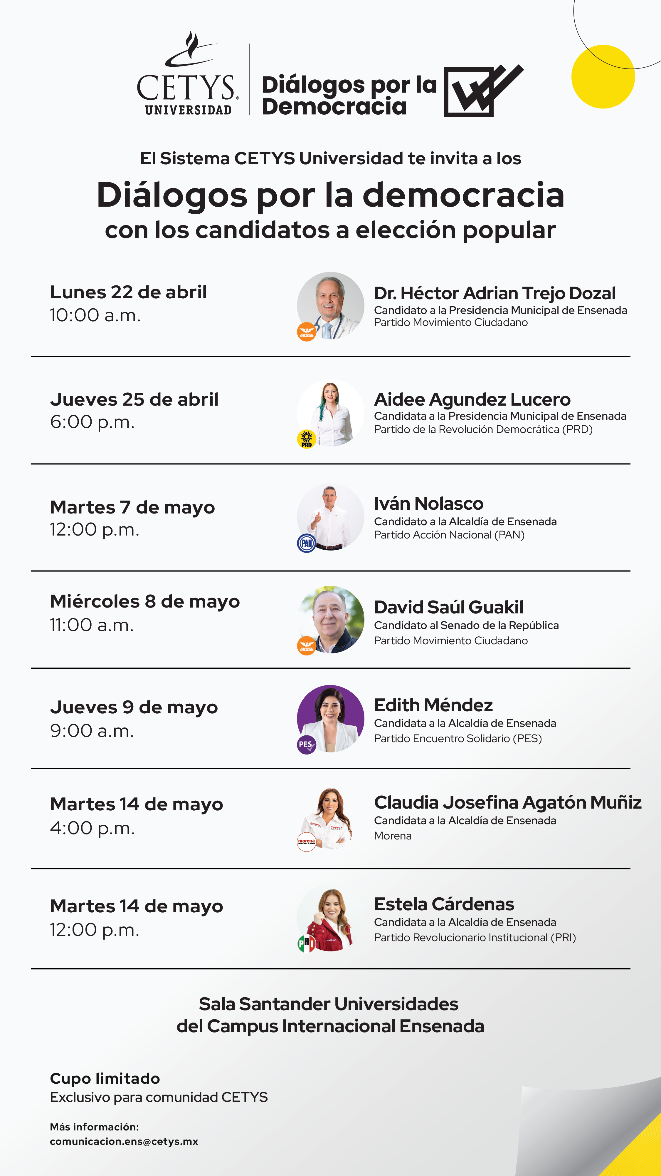 Propiciando un ambiente adecuado para el intercambio de ideas con los aspirantes de todos los partidos políticos involucrados en el presente proceso electoral y, al mismo tiempo, visibilizando a la participación ciudadana como un deber e instrumento de trascendencia para México como país, CETYS Universidad da muestra del cumplimiento de su misión educativa y compromiso con la sociedad.