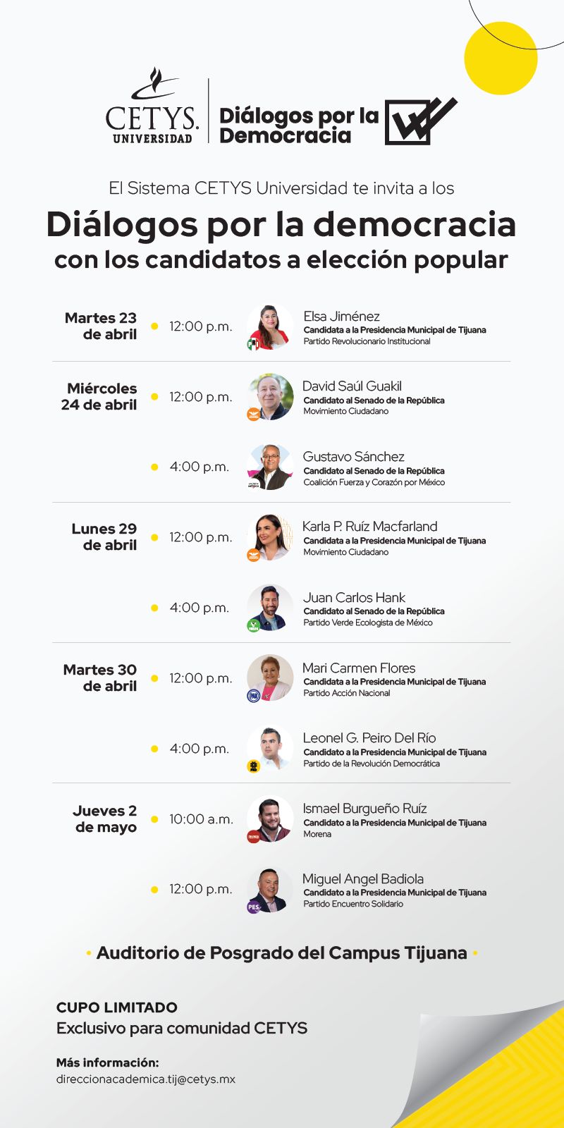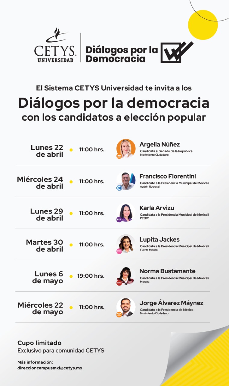 Durante las distintas sesiones de Diálogos por la Democracia, la comunidad CETYS escuchará las propuestas y puntos de vista de quienes aspiran a ocupar alguno de los cargos de elección popular que se definirán el 02 de junio, en las urnas.