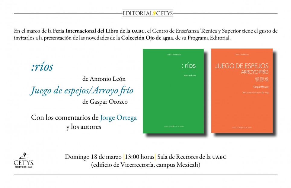 El miércoles 14 de marzo, en la Sala de Rectores en punto de las 16:00 horas, se darán a conocer dos títulos: Mediodía. Estampas del México ignorado, de Patricio Bayardo Gómez, y Un jardín con alas. Relatos la nana Chinda, de Alberto Gárate Rivera, que conforman la Colección Panoplia del Centauro, especializada en textos narrativos. Mientras que el domingo 18 de marzo, en la misma sala pero a las 13:00 horas, los autores Antonio León y Gaspar Orozco presentan sus poemarios de la Colección Ojo de Agua: : ríos y Juego de espejos. Ambos eventos serán precedidos por los comentarios de Jorge Ortega, coordinador general del Programa Editorial.