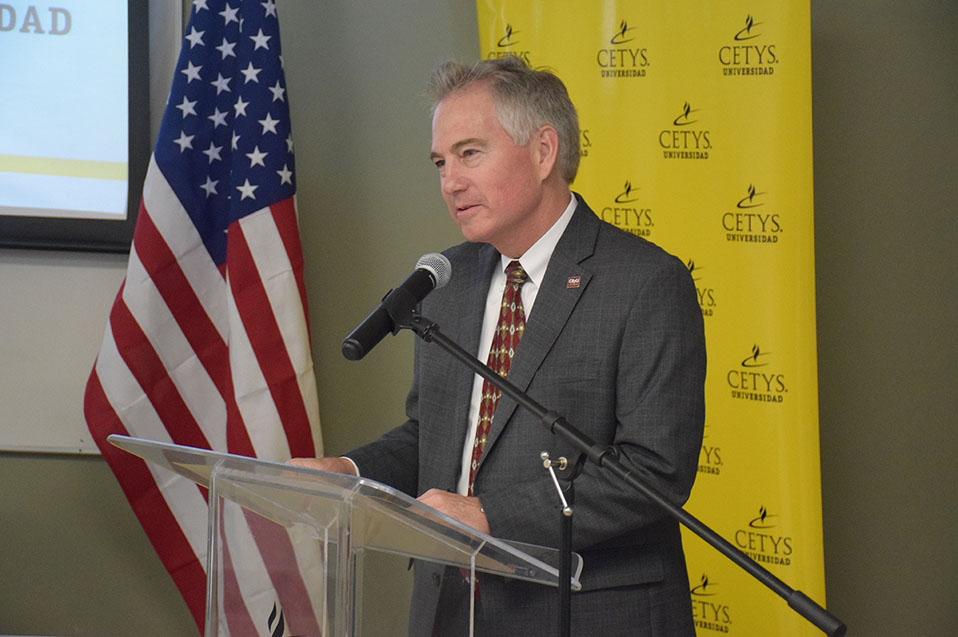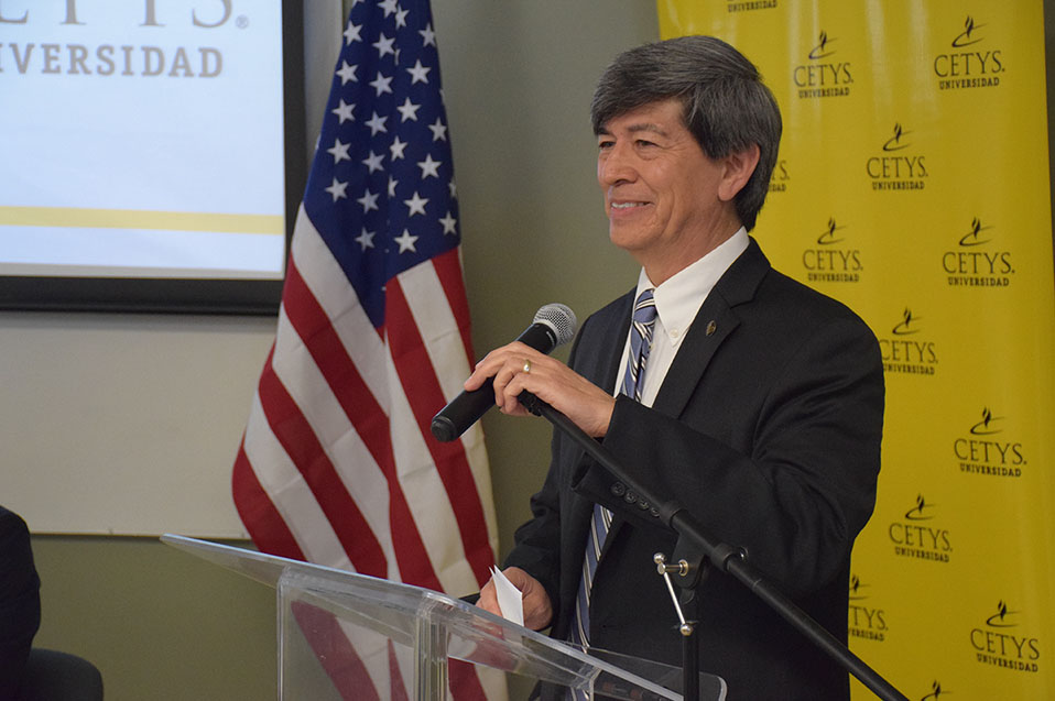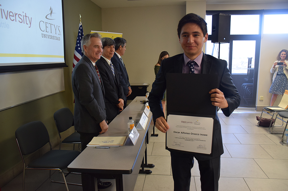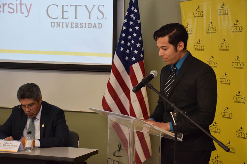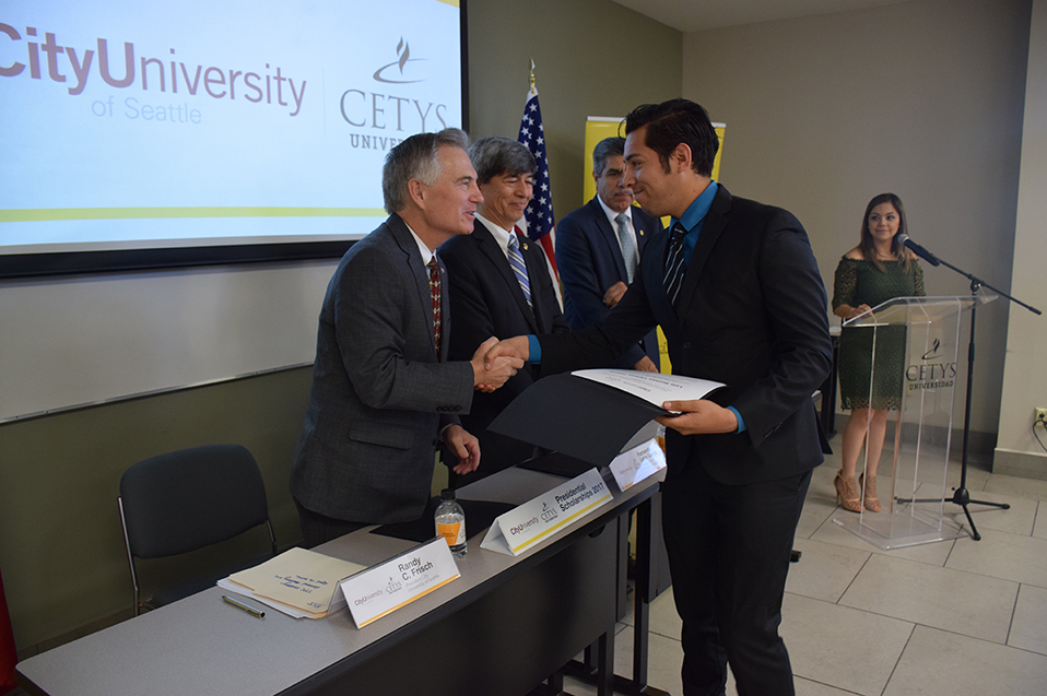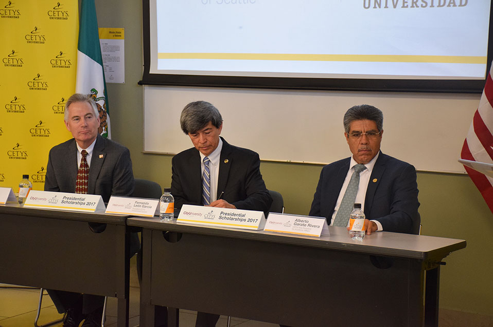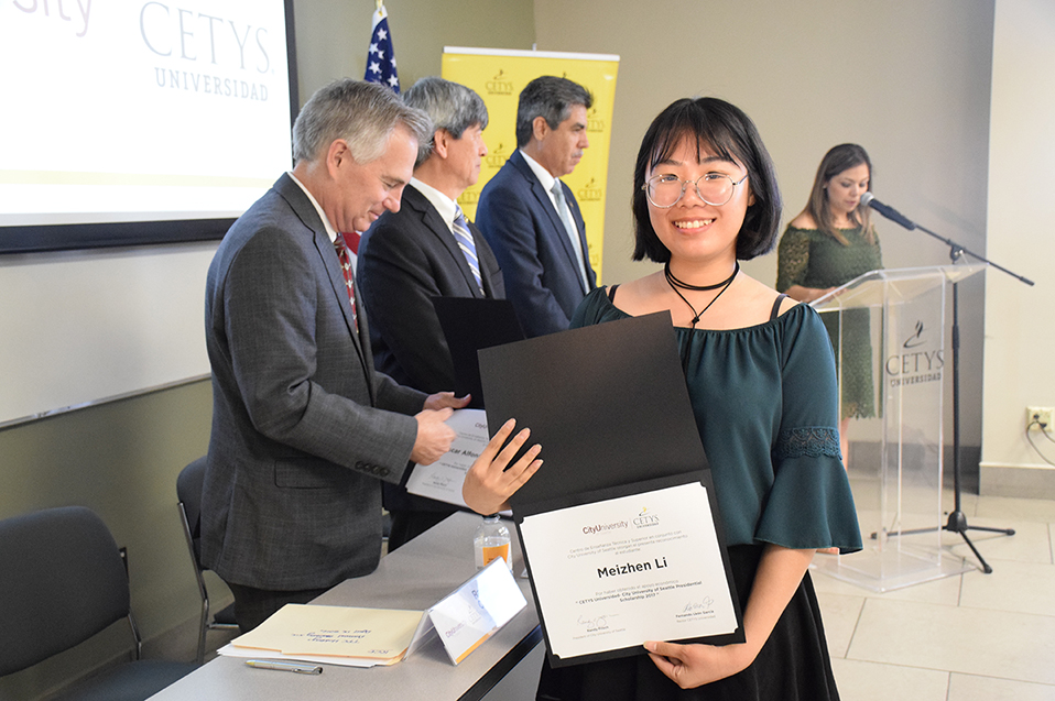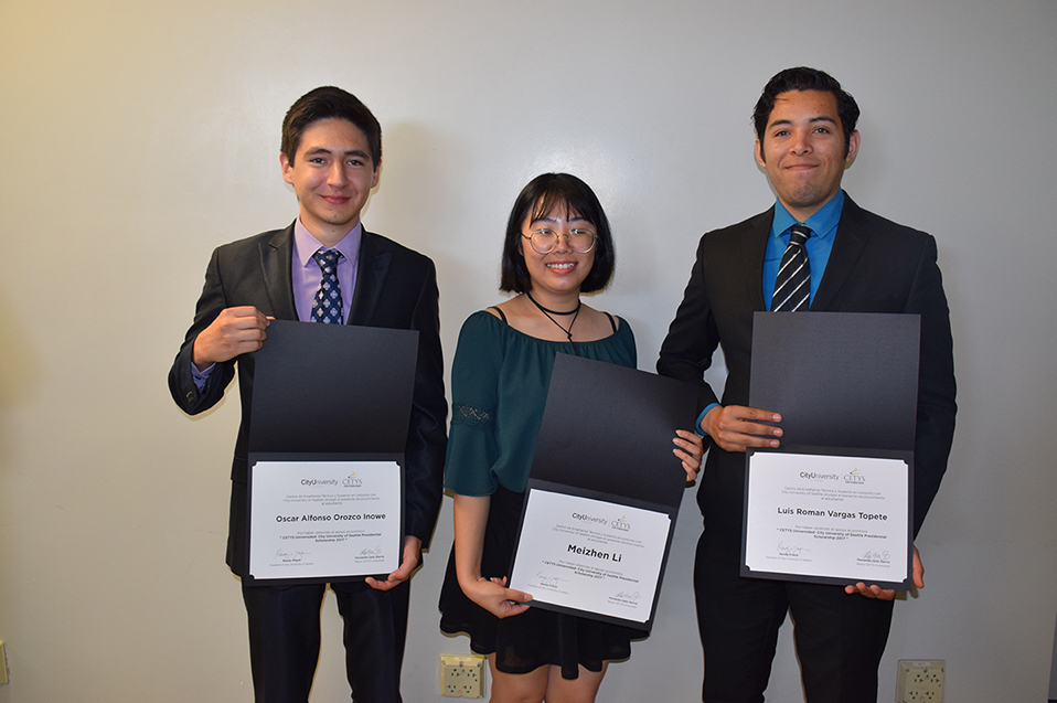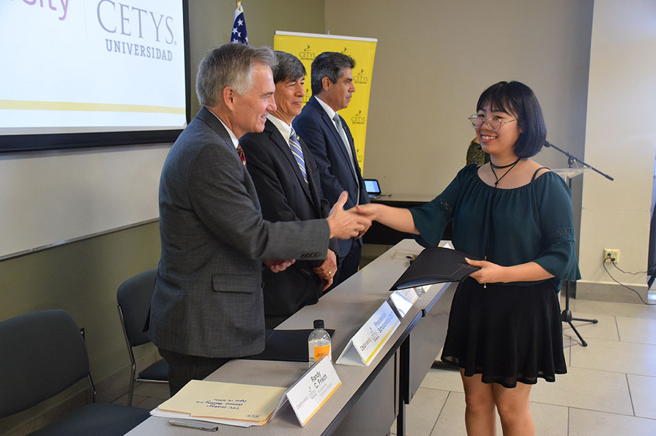 Los alumnos Meizhen Li, alumna de Ingeniería Mecánica en Campus Mexicali; Luis Román Vargas Topete, alumno de Ingeniería Industrial en Campus Tijuana, y Óscar Alfonso Orozco Inowe, alumno de Ingeniería en Cibernética Electrónica Campus Ensenada, recibieron constancia de patrocinio en manos de las máximas autoridades de ambas instituciones, lo que les permitirá finalizar sus estudios profesionales en el extranjero.