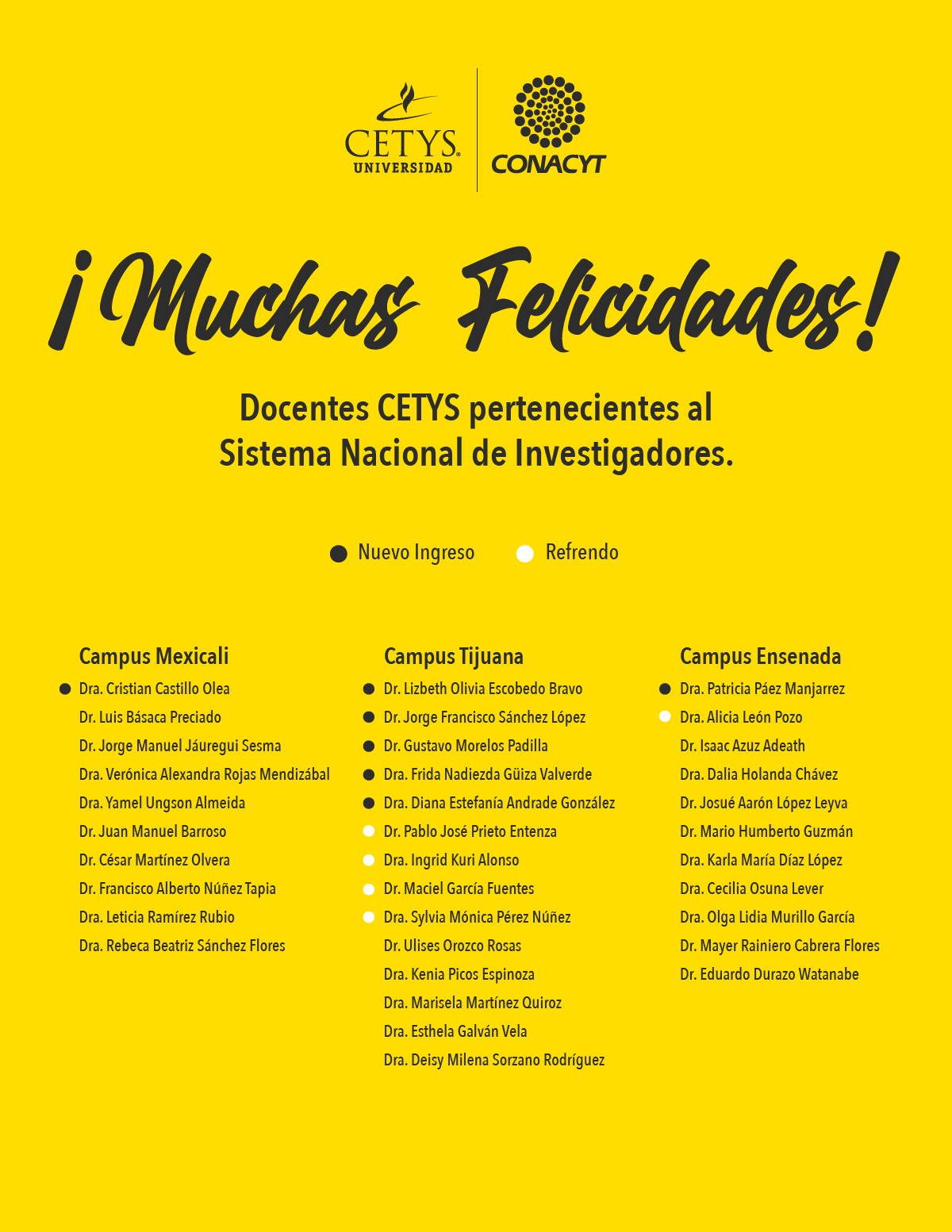 En su misión de generar sinergias entre industria, sociedad, gobierno y academia, los docentes de CETYS se desempeñan como investigadores que aportan su conocimiento para el mejoramiento de su comunidad. Es así que fueron reconocidos como parte del Sistema Nacional de Investigadores (SNI) del Consejo Nacional de Ciencias y Tecnología (Conacyt) para el 2023.